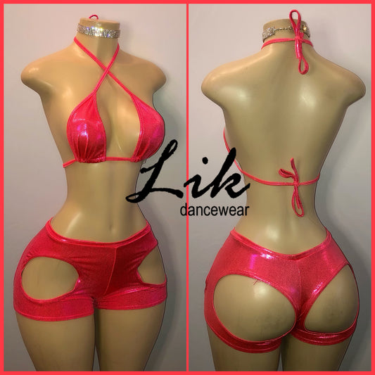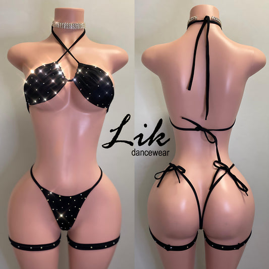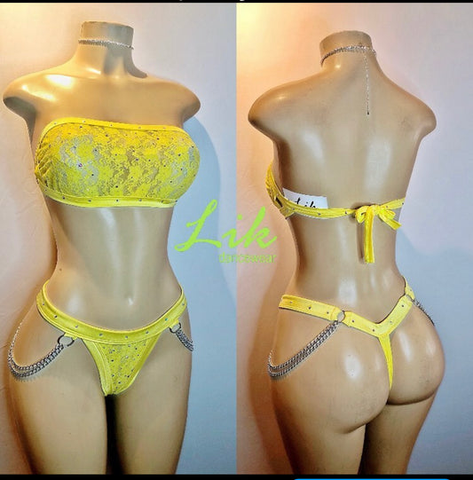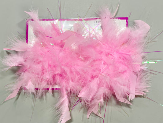 Felt Feather Trimmed Mesh Two Piece Set with Rhinestones for Exotic Dancers