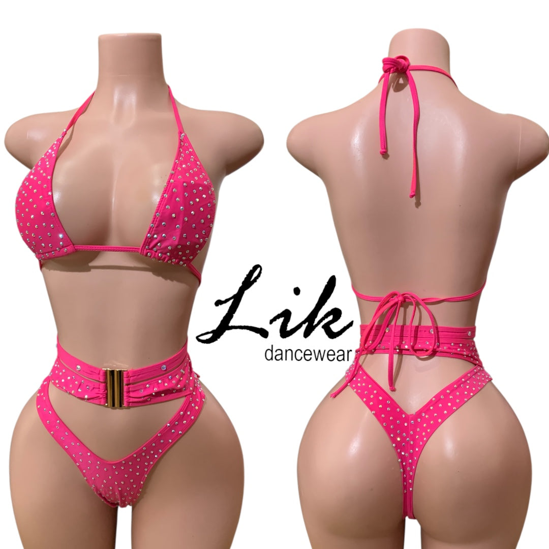 The Alejandra two piece bikini set boasts a stylish belt and dazzling rhinestone embellishments. Available in one size, it comfortably fits those weighing between 120 to 175 pounds. Upgrade your dance bag with this elegant and chic ensemble.