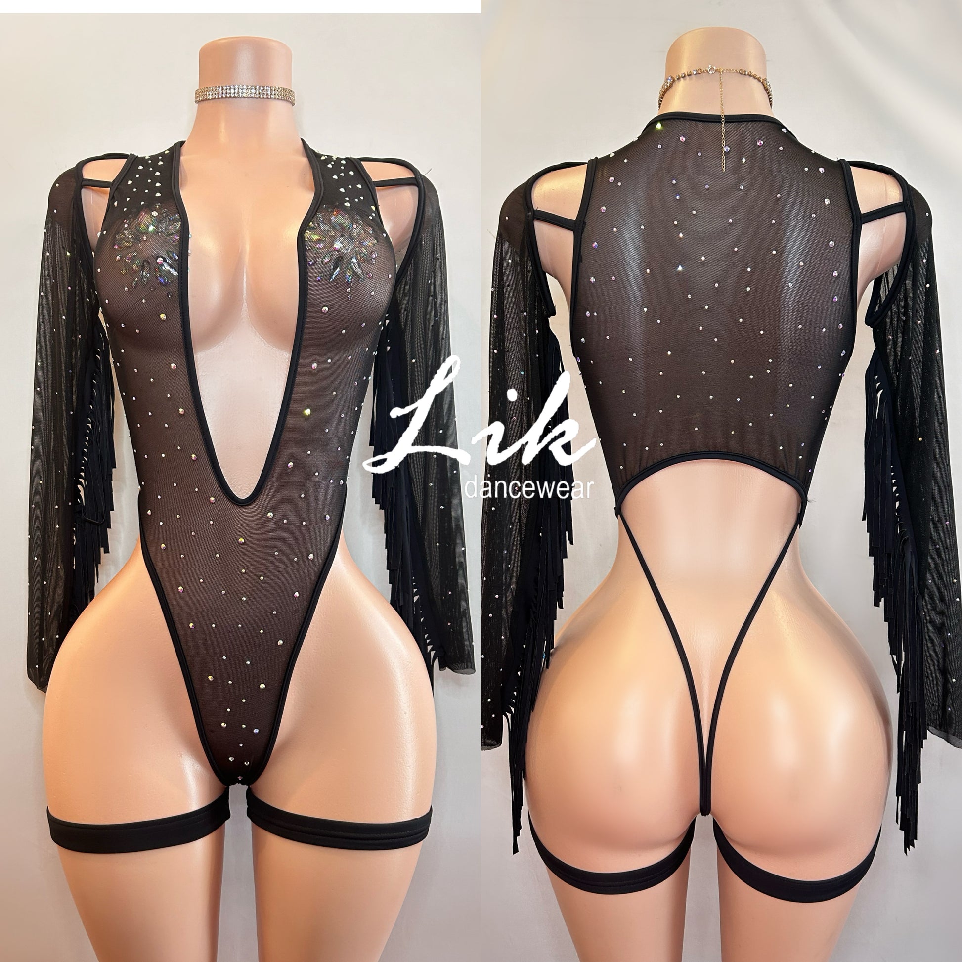 Beautiful plunging neckline one piece with flowing fringe trim on sleeves covered with rhinestone embellishments