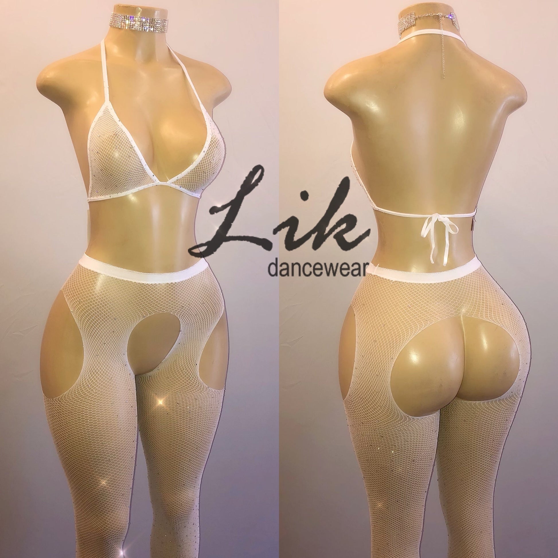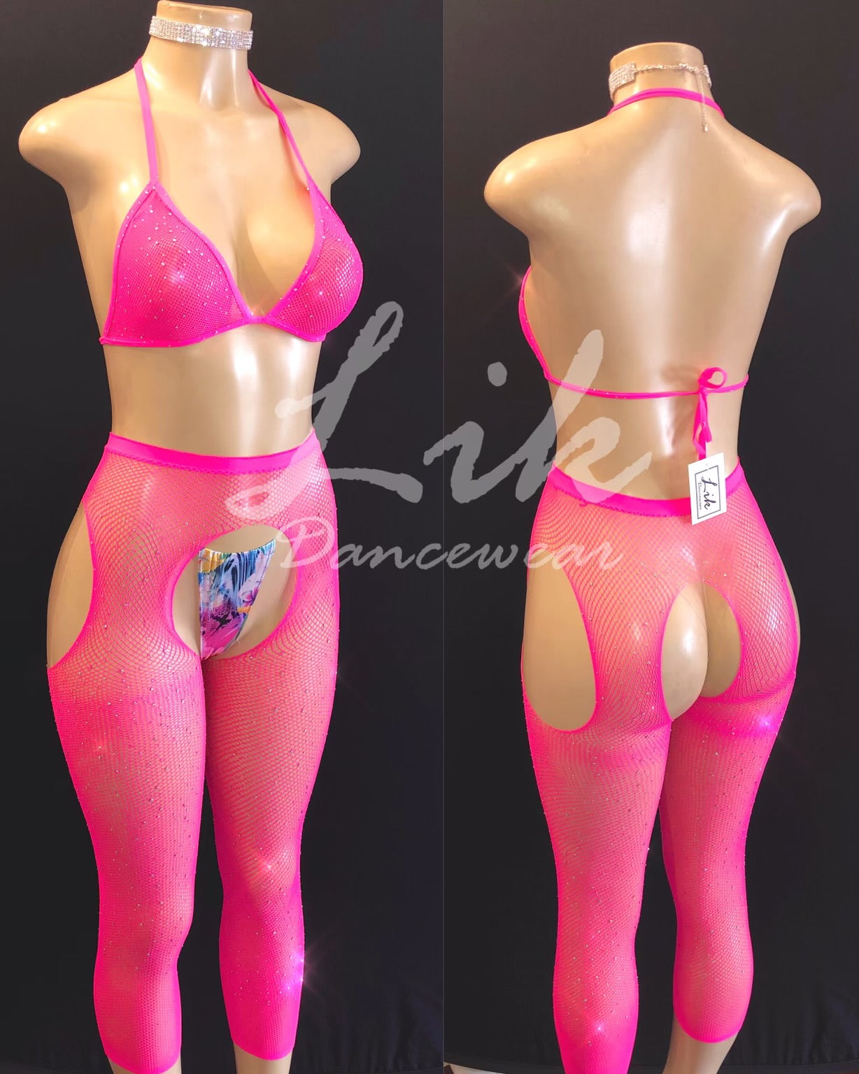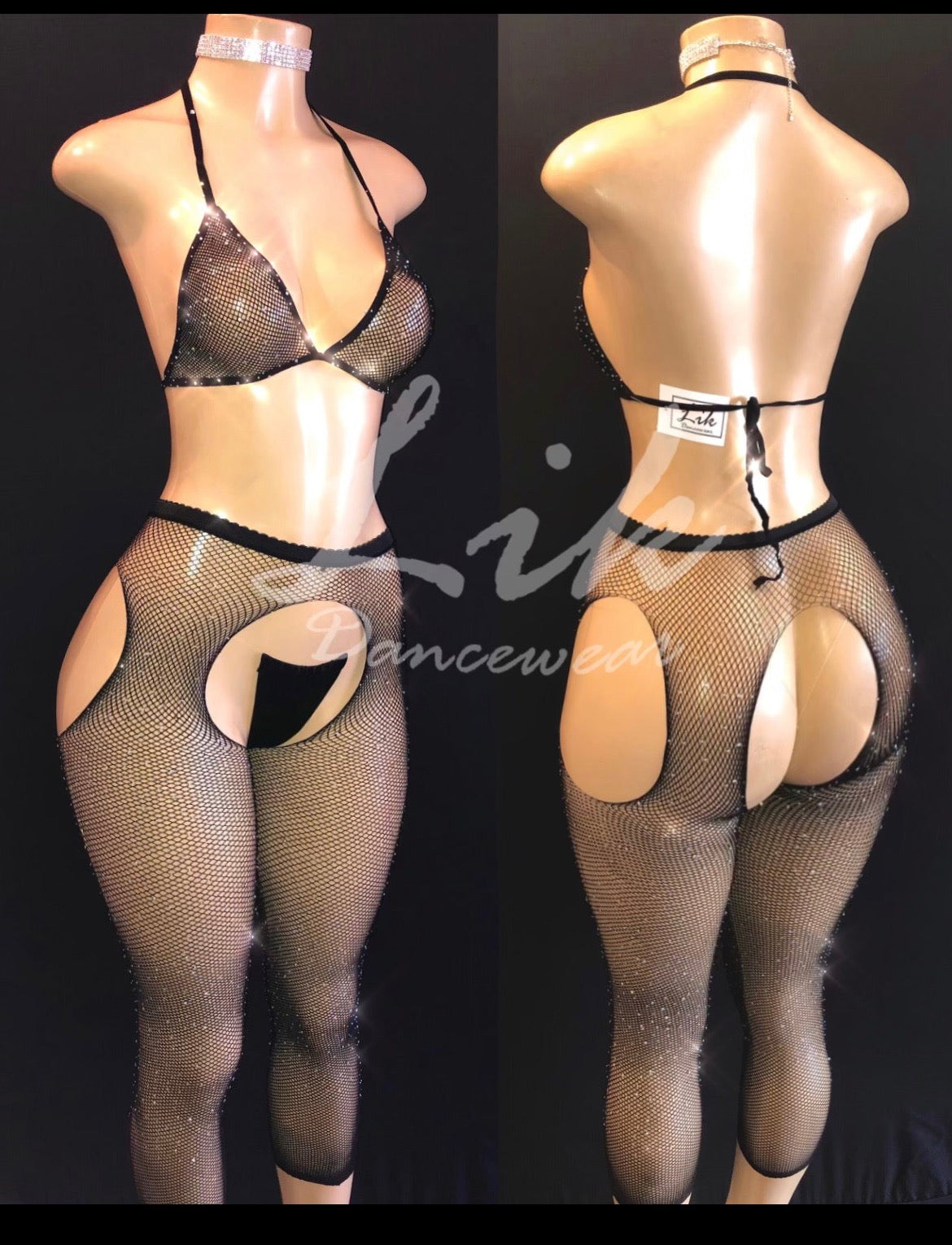 Fishnet two piece embellished in rhinestones with bikini top and garter like bottoms. Invisible thong sold separately.