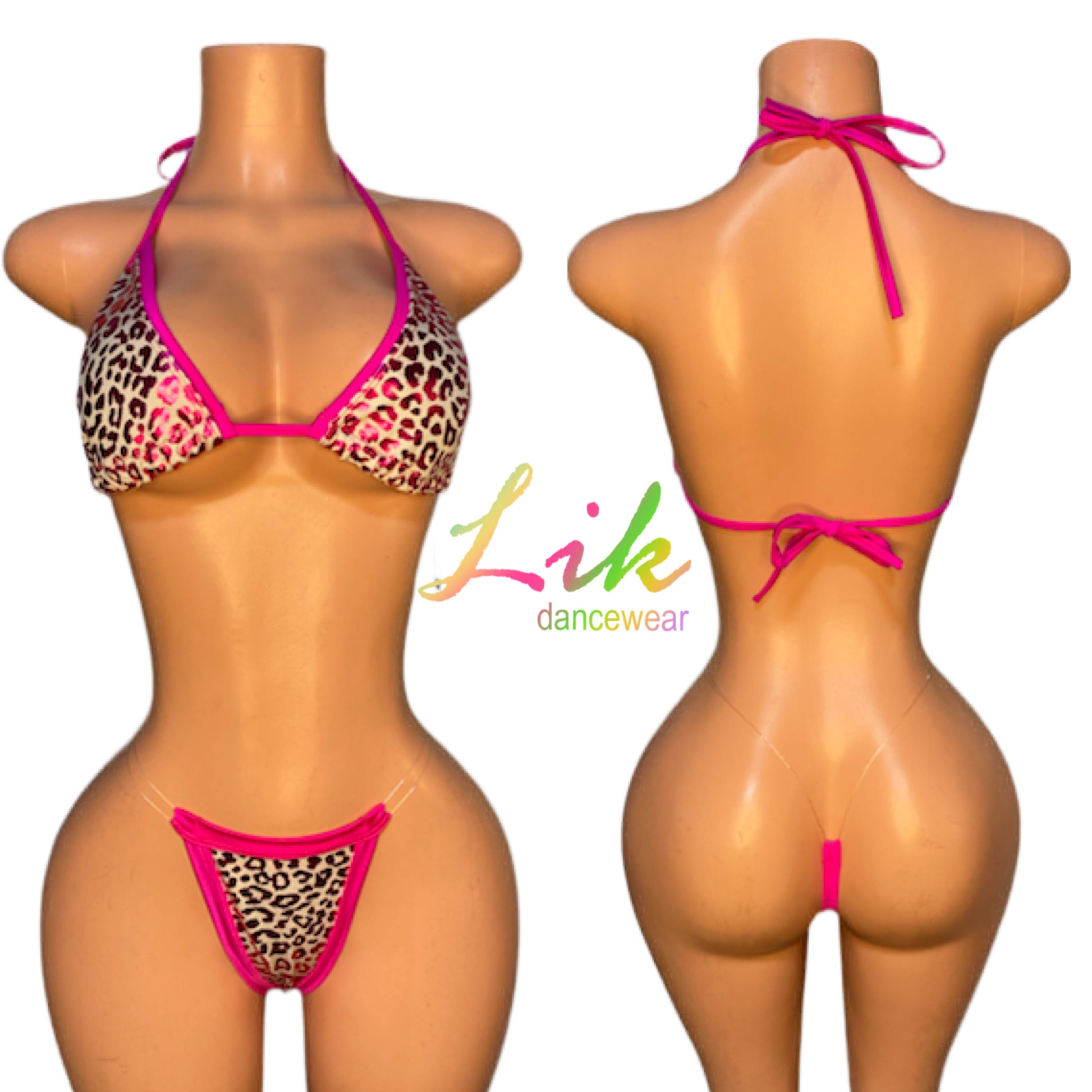 Two piece set with bikini top and invisible thong embellished in rhinestones. Ties at neck and back