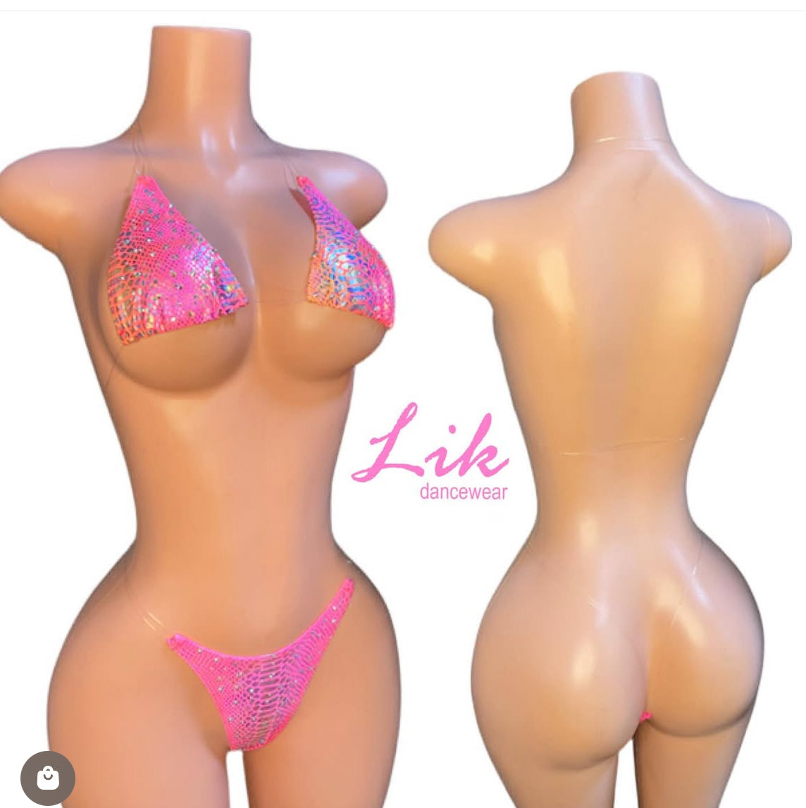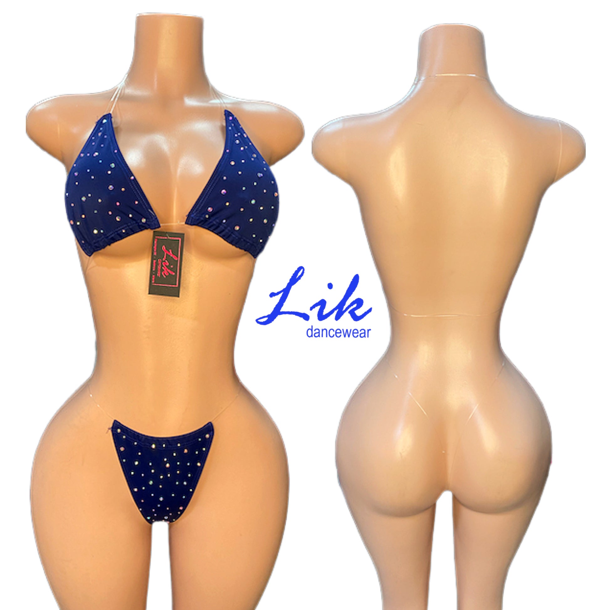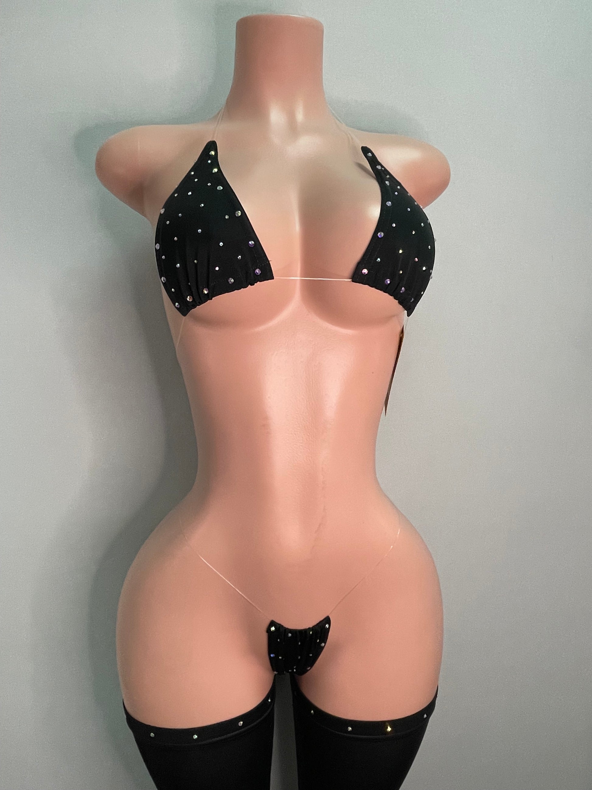 Invisible string bikini and thong with either prints or rhinestones all over. Barley there so we call her naked.
