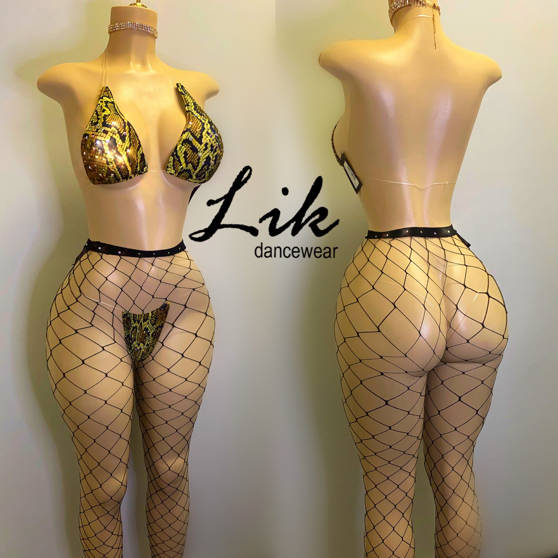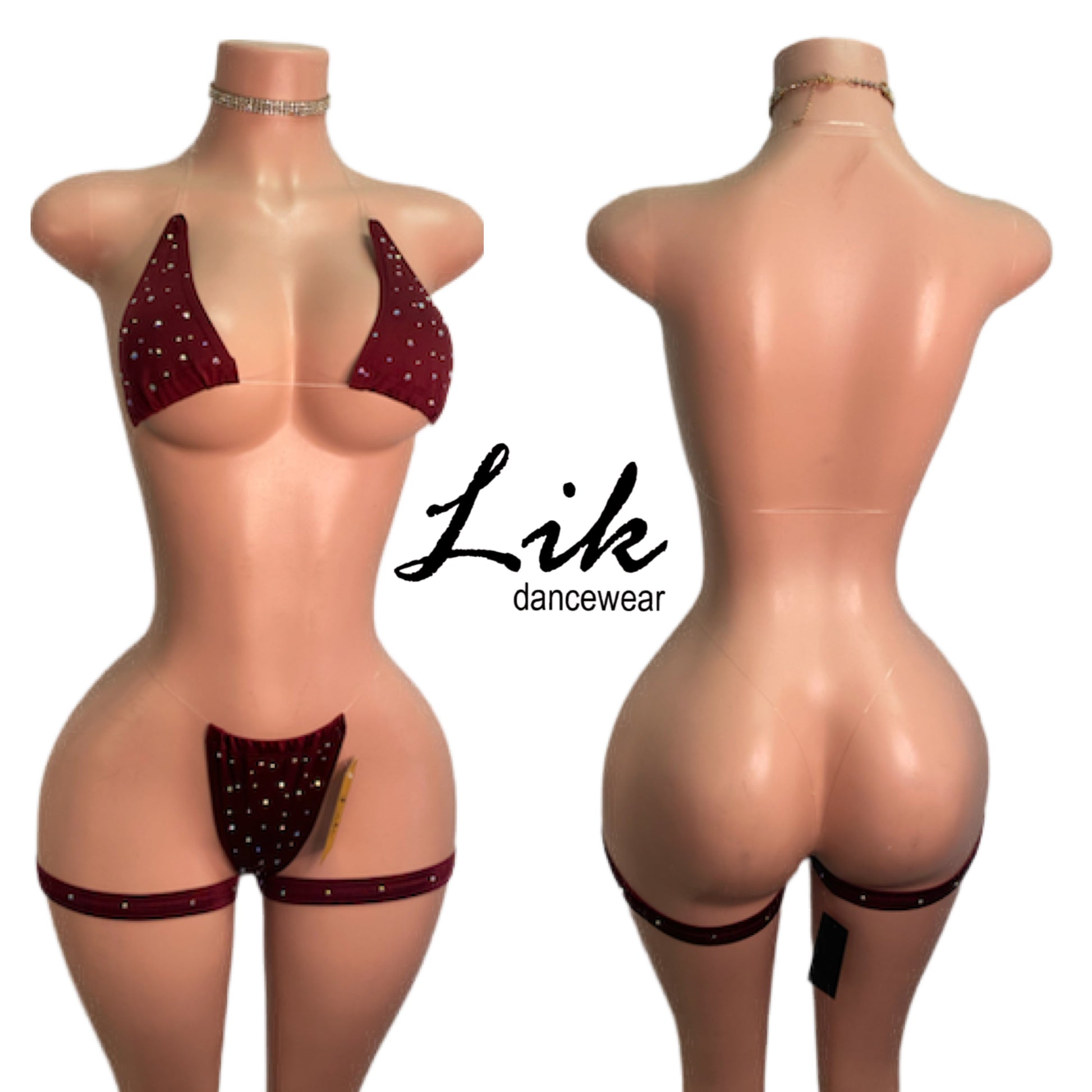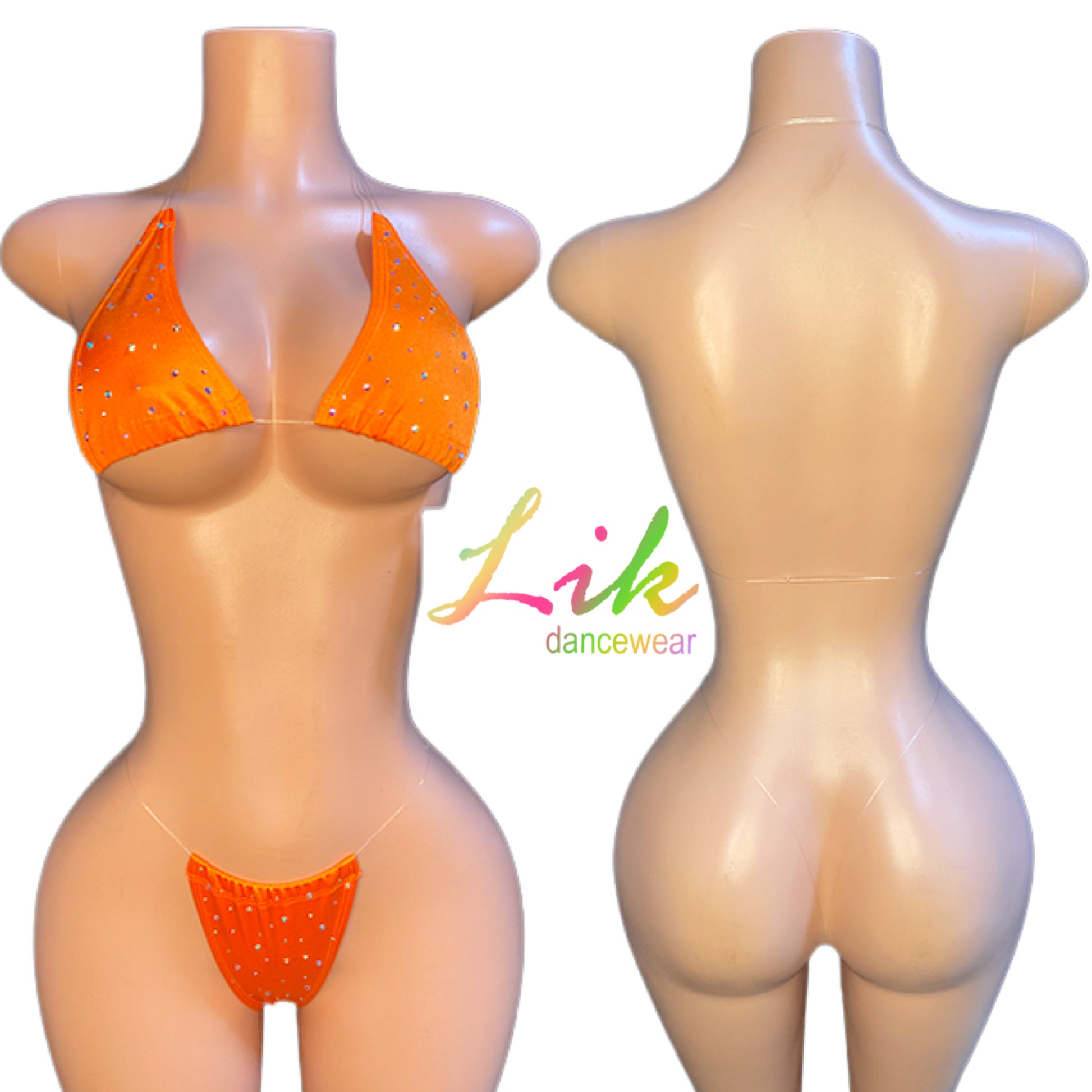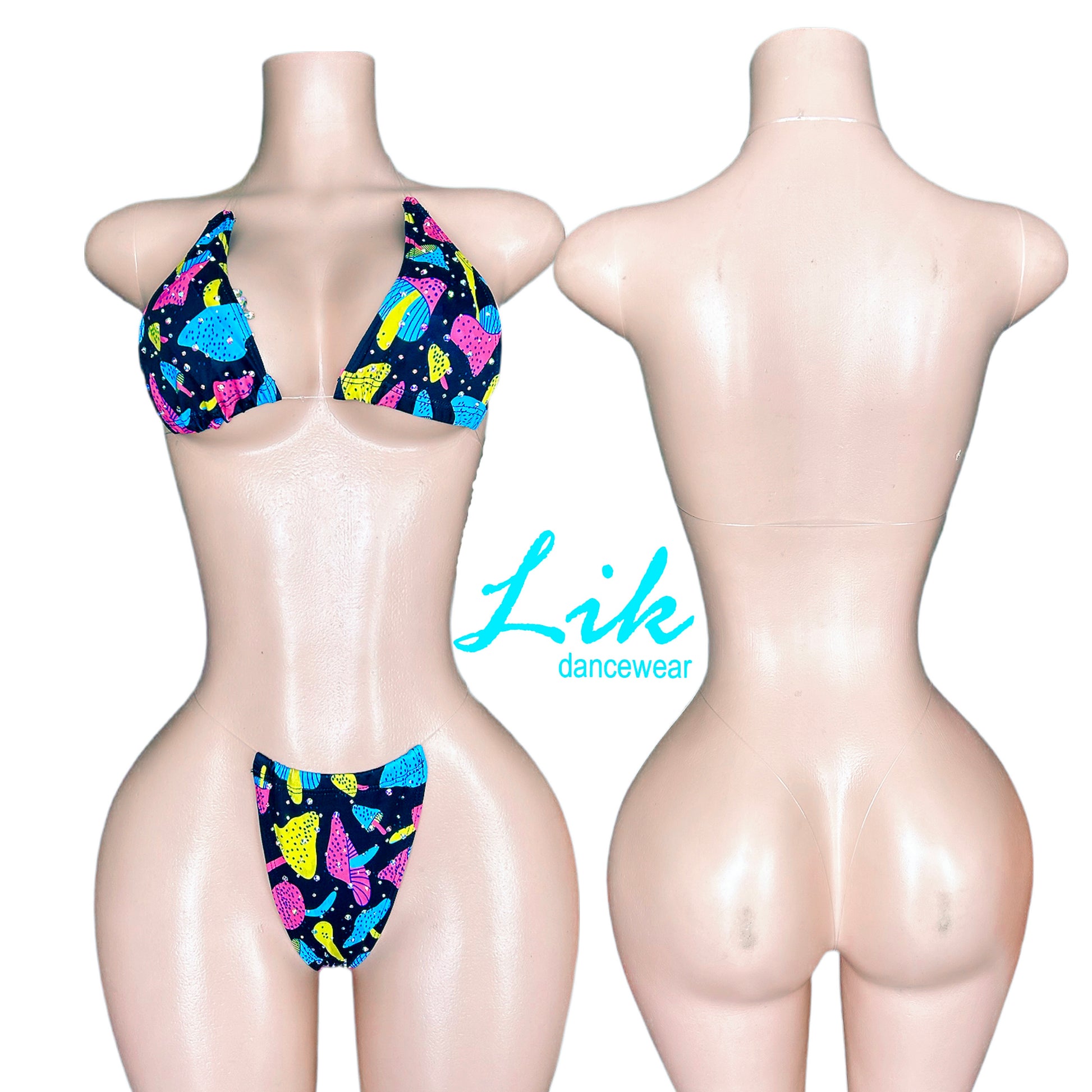Invisible string bikini and thong with either prints or rhinestones all over. Barley there so we call her naked.