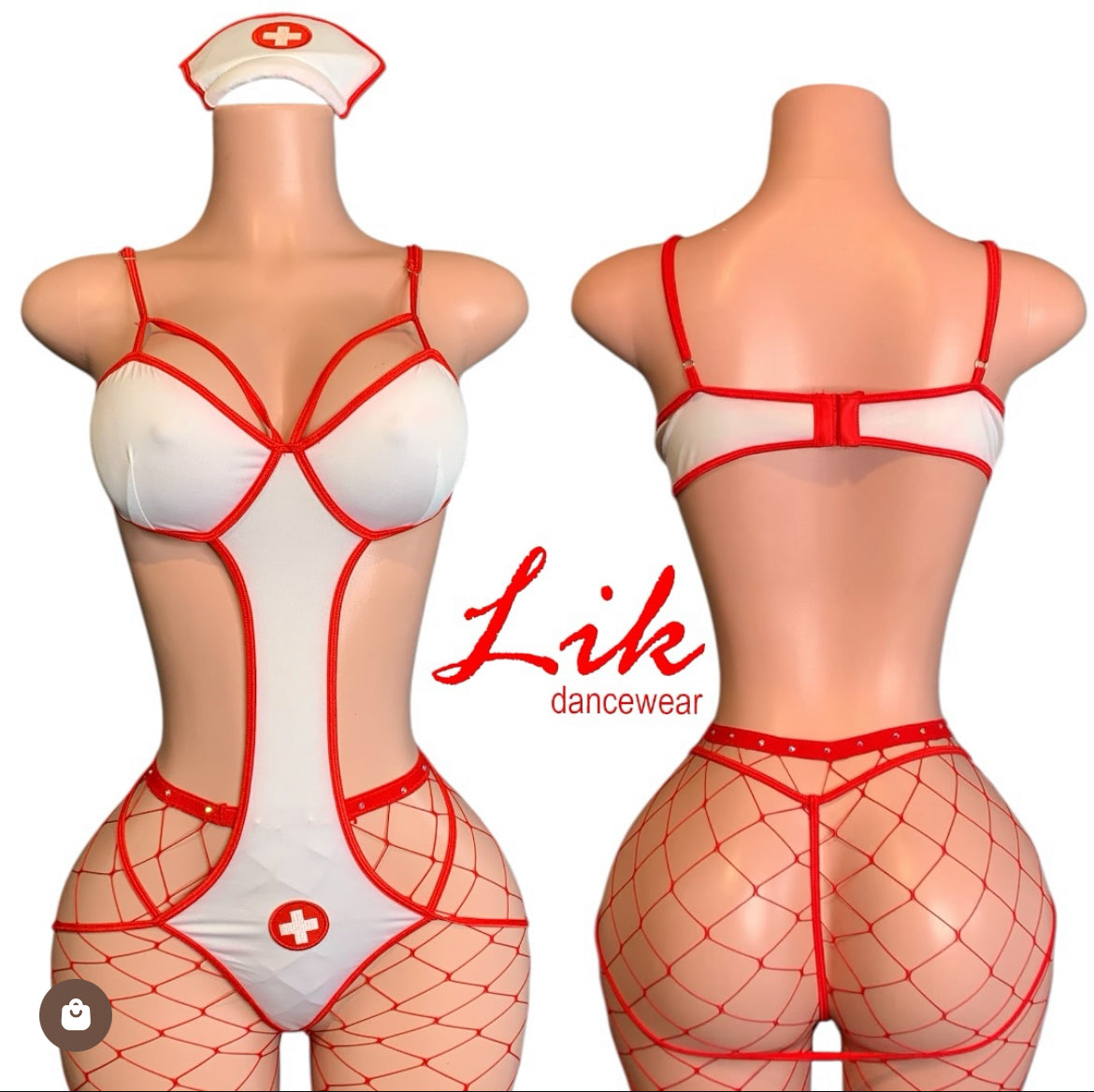 Strappy sexy nurse one piece costume with nurse cap. Perfect for strip club Halloween party or private doctor and nurse party.