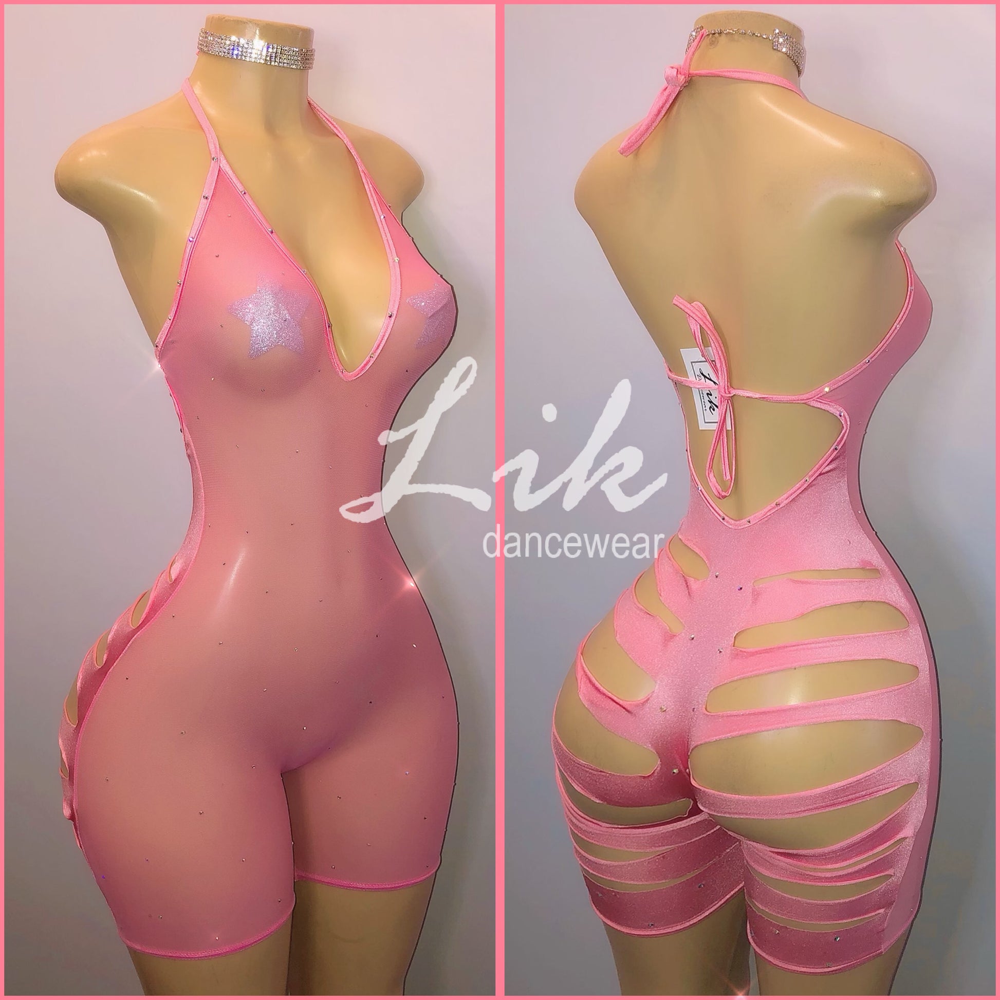 Sexy fitted halter neck romper with slash on but area and rhinestone accents on chest fits best 120 -160 lbs