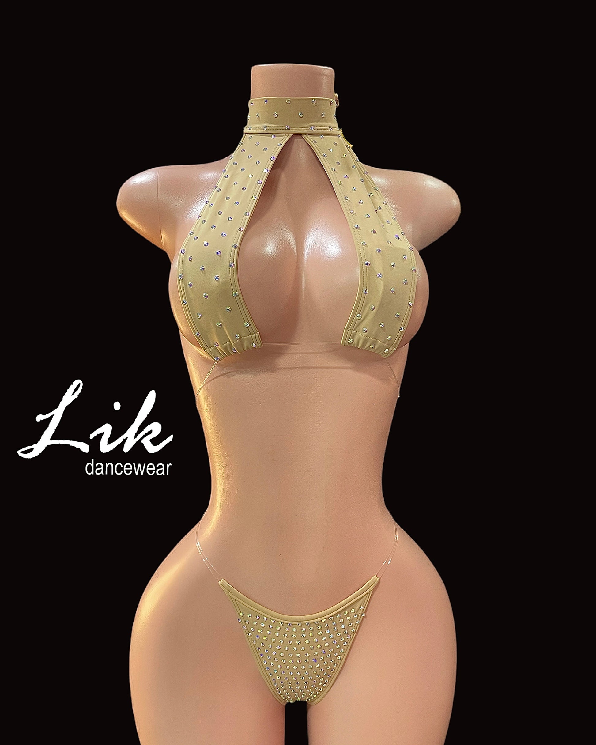 Introducing the F1 stripper clear strap thong set, featuring rhinestone-covered straps that connect to a neck collar. The top and bottom are held in place by clear adjustable straps, giving you a sleek and sexy look on the beach or at the strip club. This adult outfit is one size fits most.