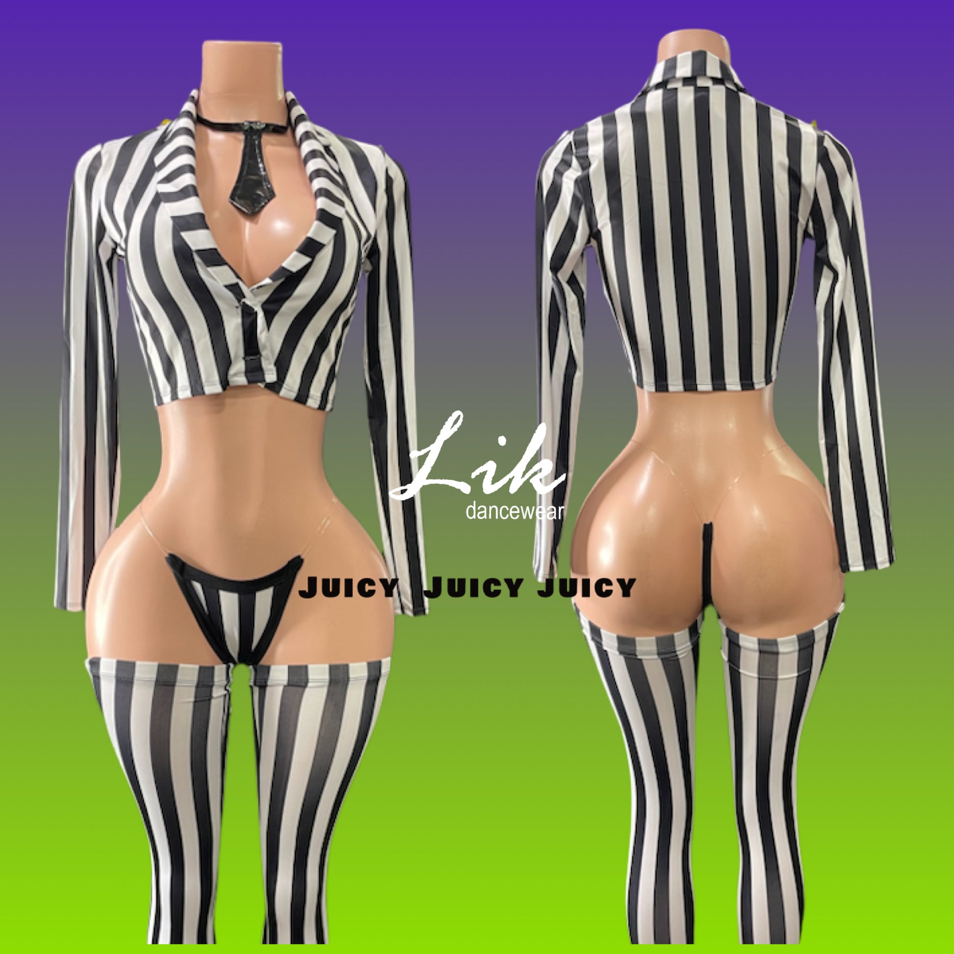 3-piece sexy movie character costume features striped romper and cropped blazer and vinyl tie shaped choker.