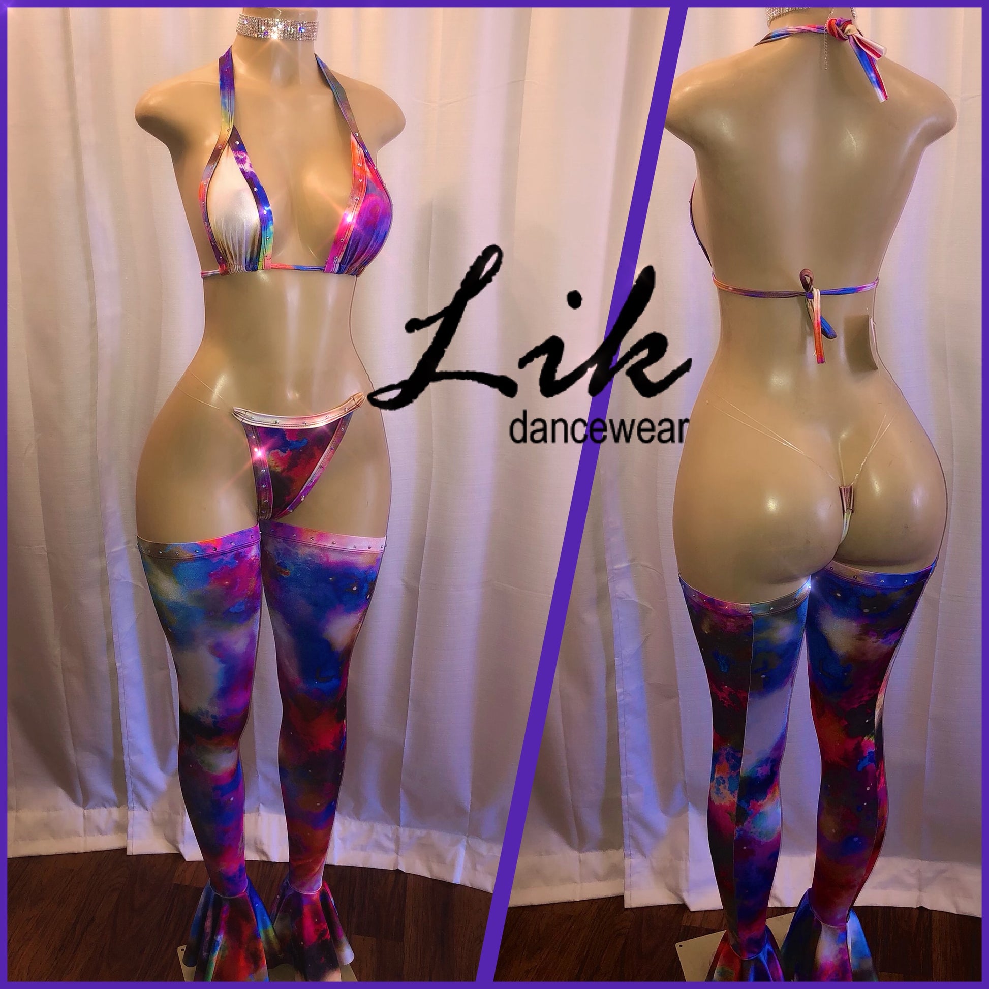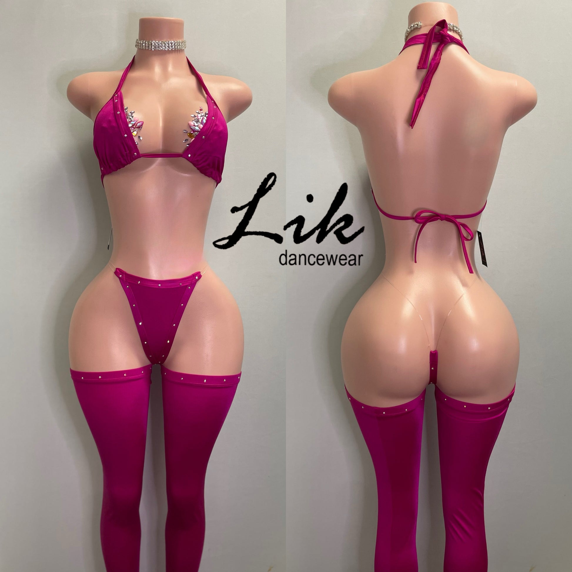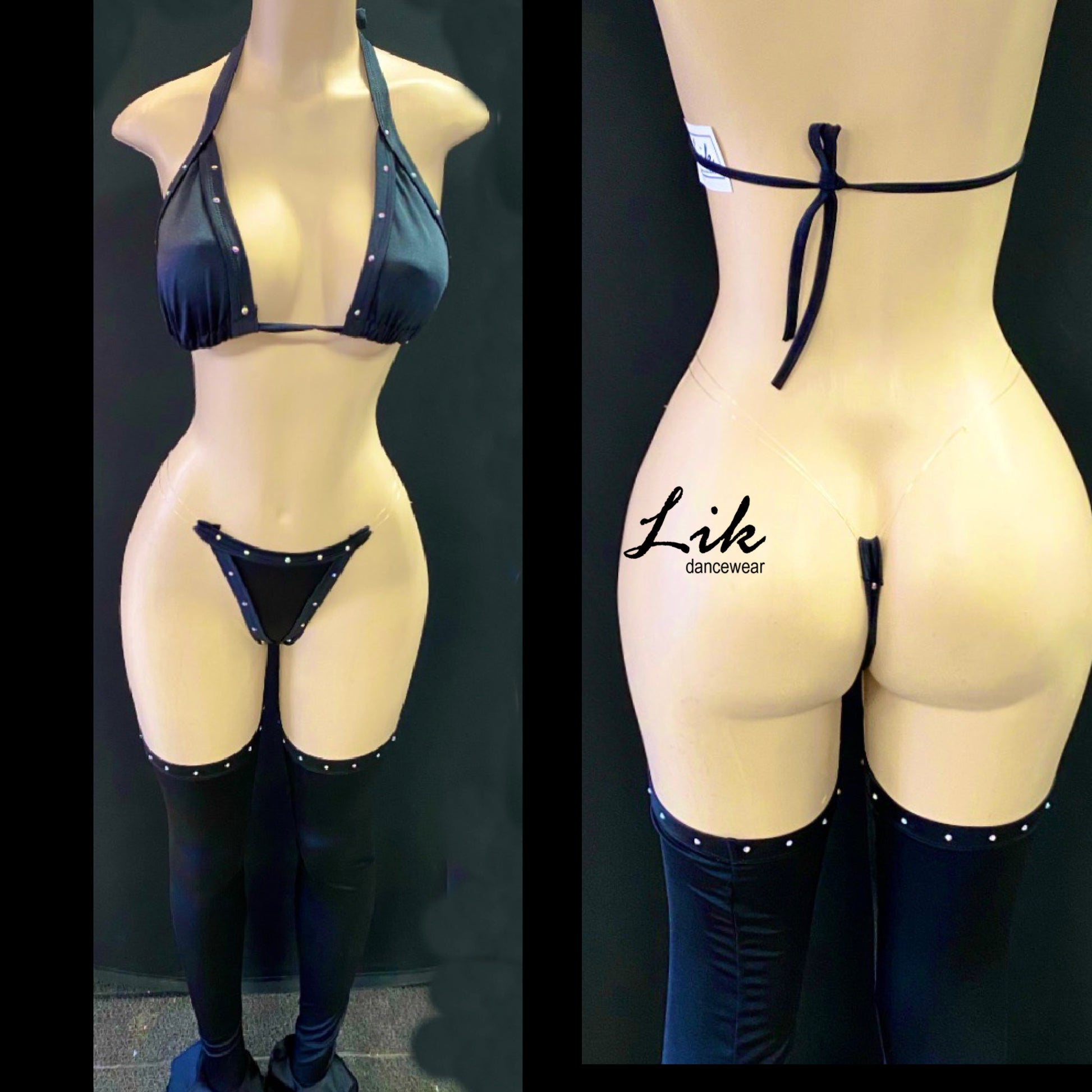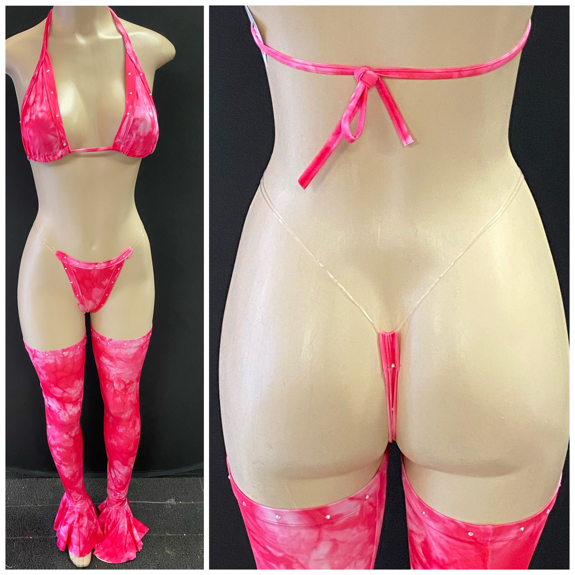 A three piece set with invisible thong and leg/shoe cover. Nylon spandex fabric