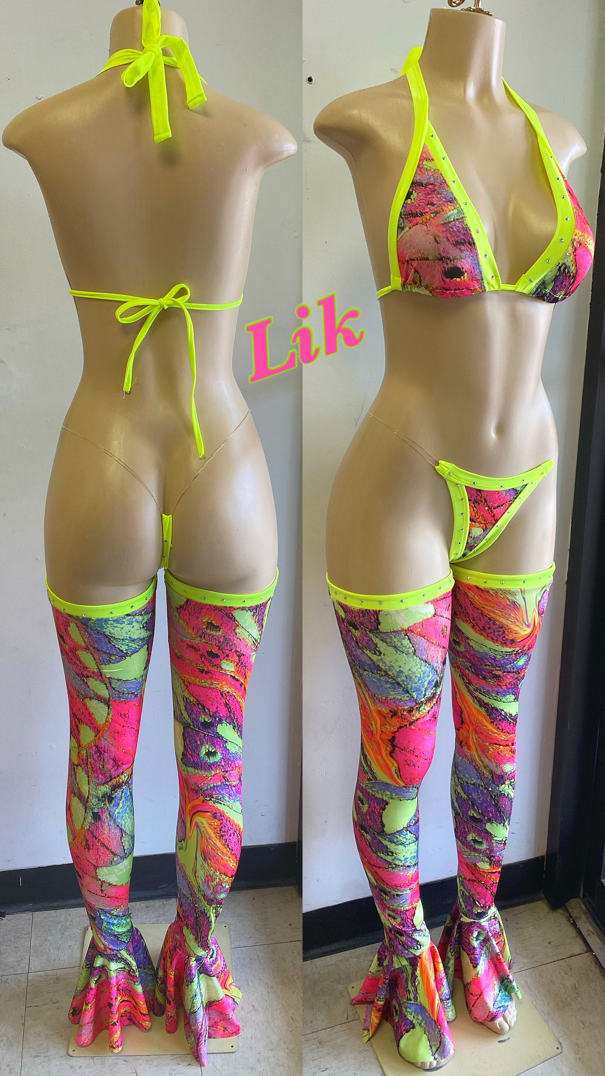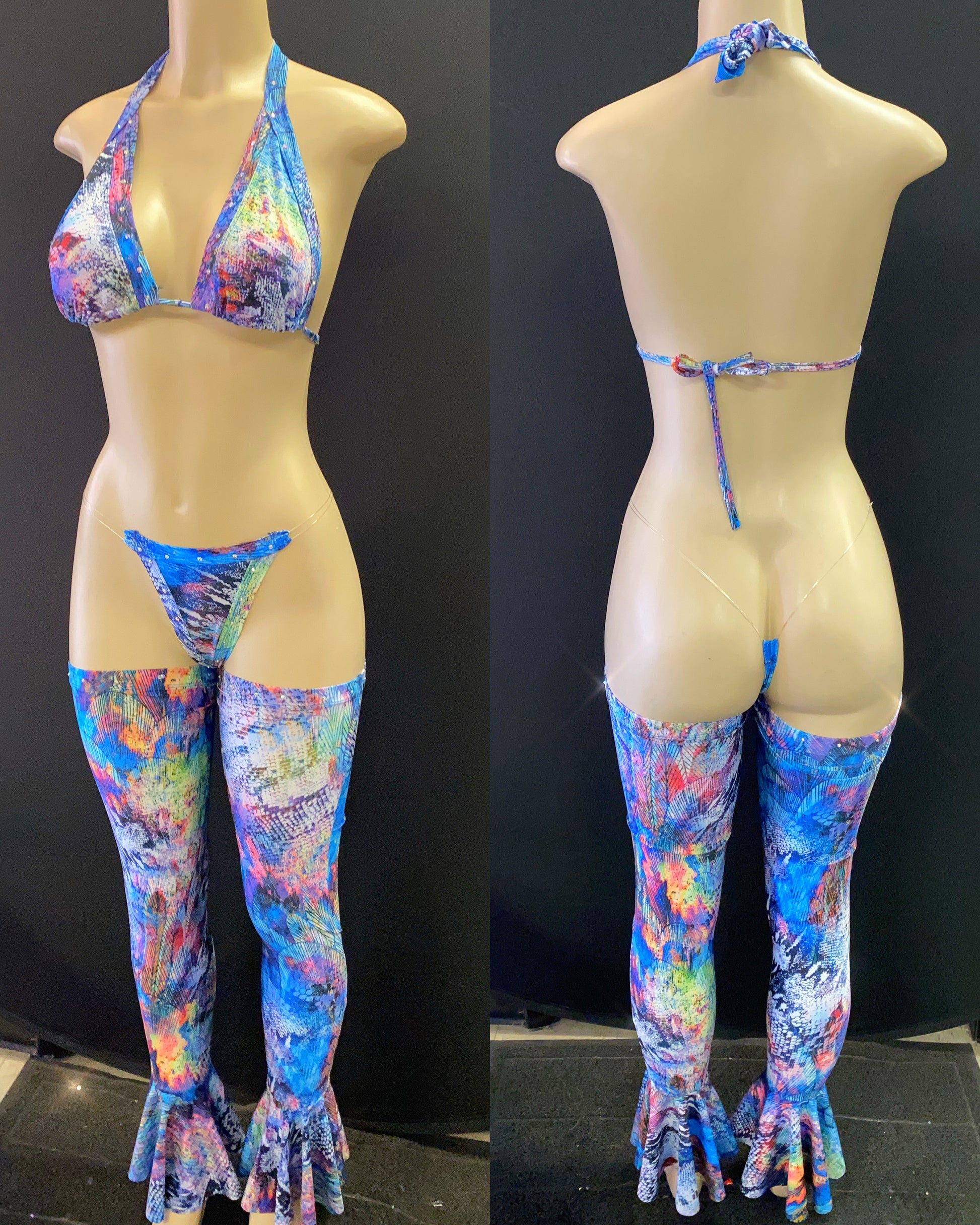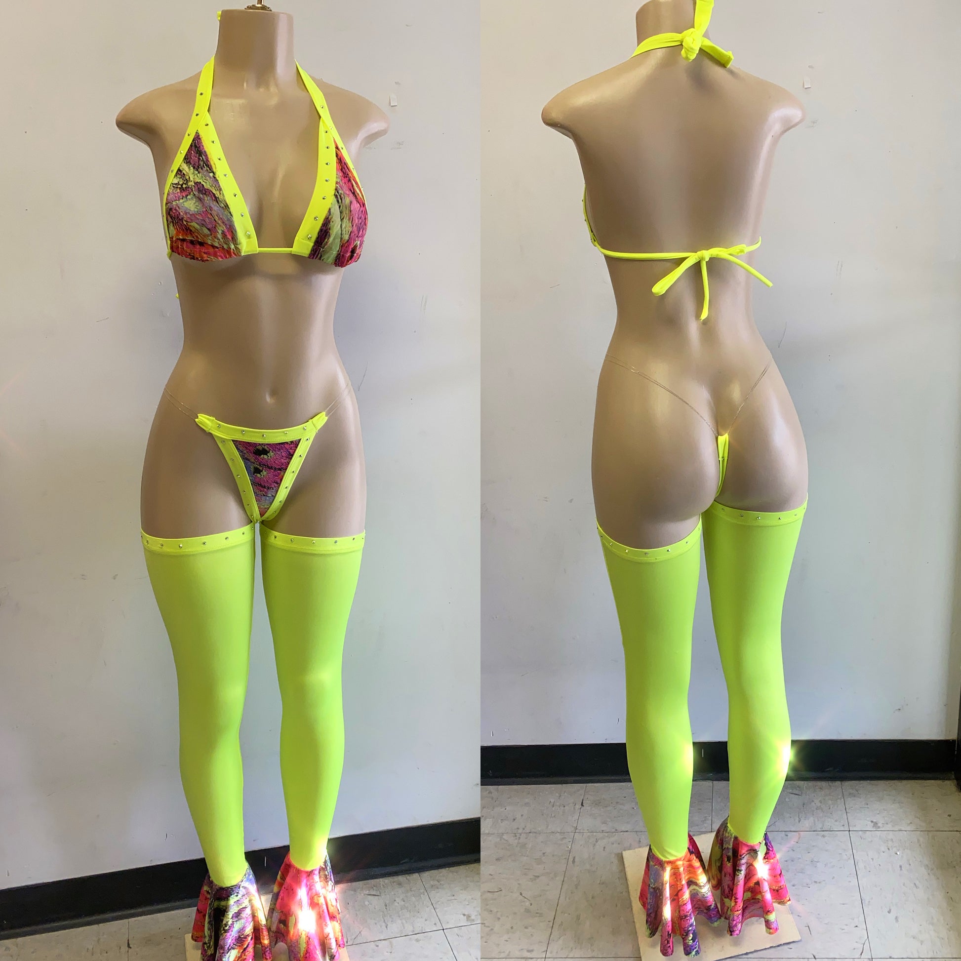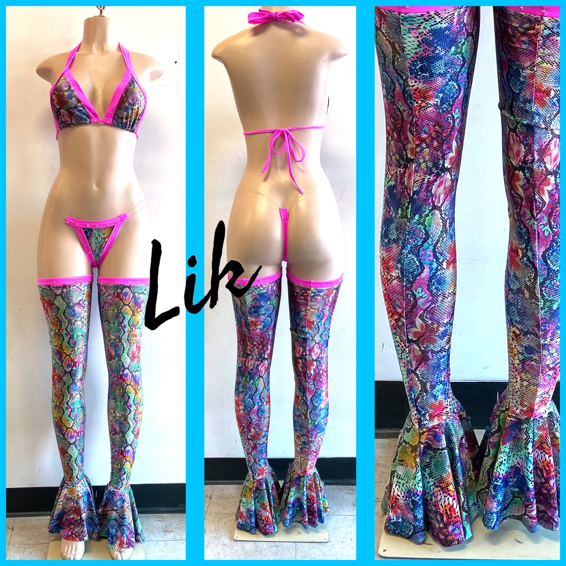 A three piece set with invisible thong and leg/shoe cover. Nylon spandex fabric
