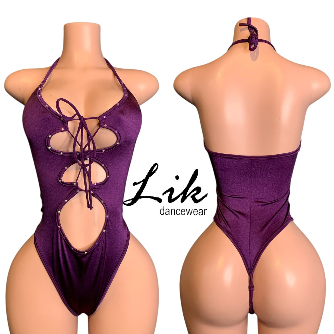 This playful one-piece features a trendy lace-up front and a flirty keyhole detail, both beautifully accented with sparkling rhinestone trims. The necktie adds a fun finishing touch while allowing you to adjust for the perfect fit. Perfect for adding a little sparkle to your night!