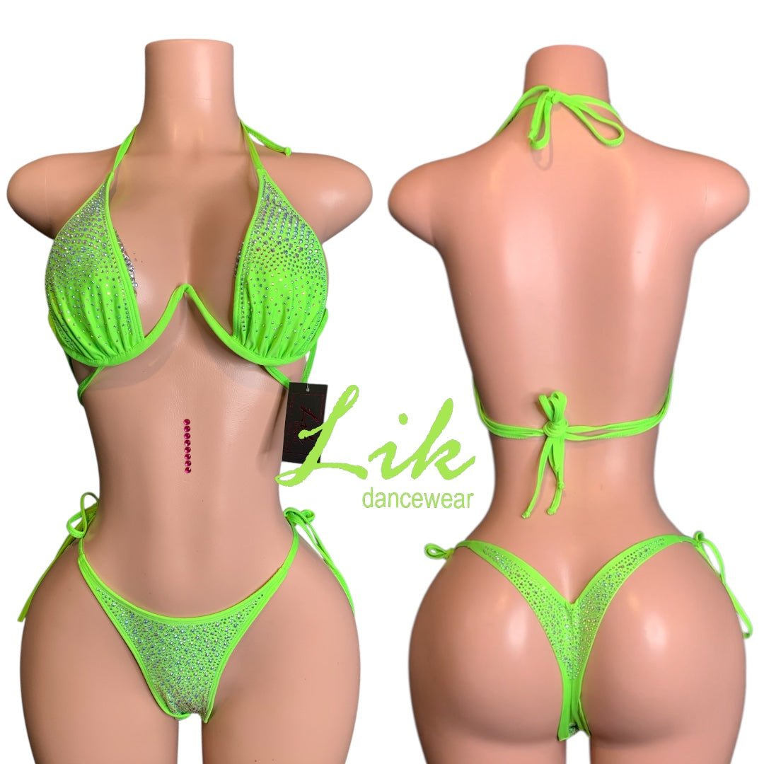 Heavily bedazzled underwire bra with adjustable straps, matching bottoms