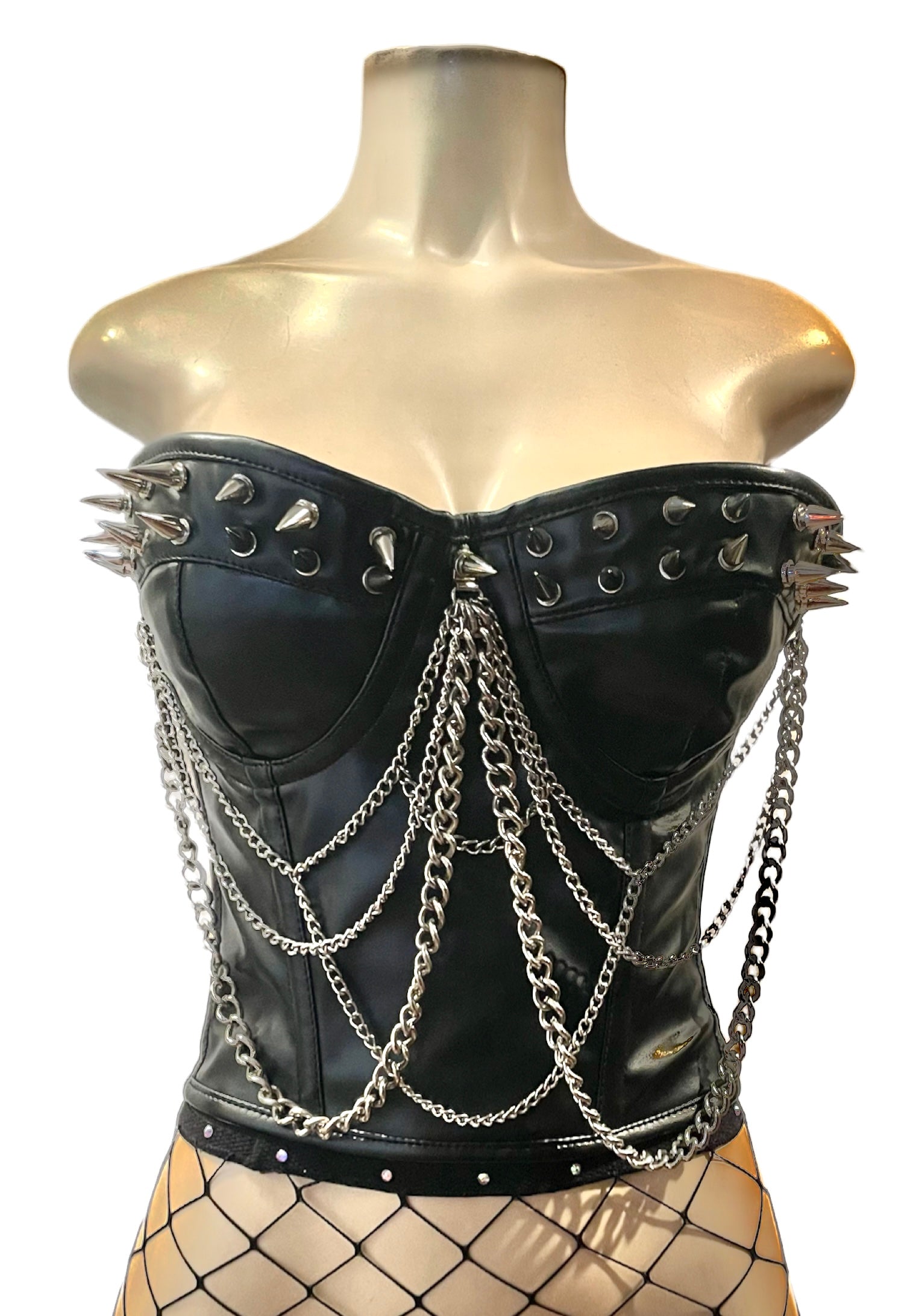 Over bust leather corset with lace up back adorned with spikes and chains.