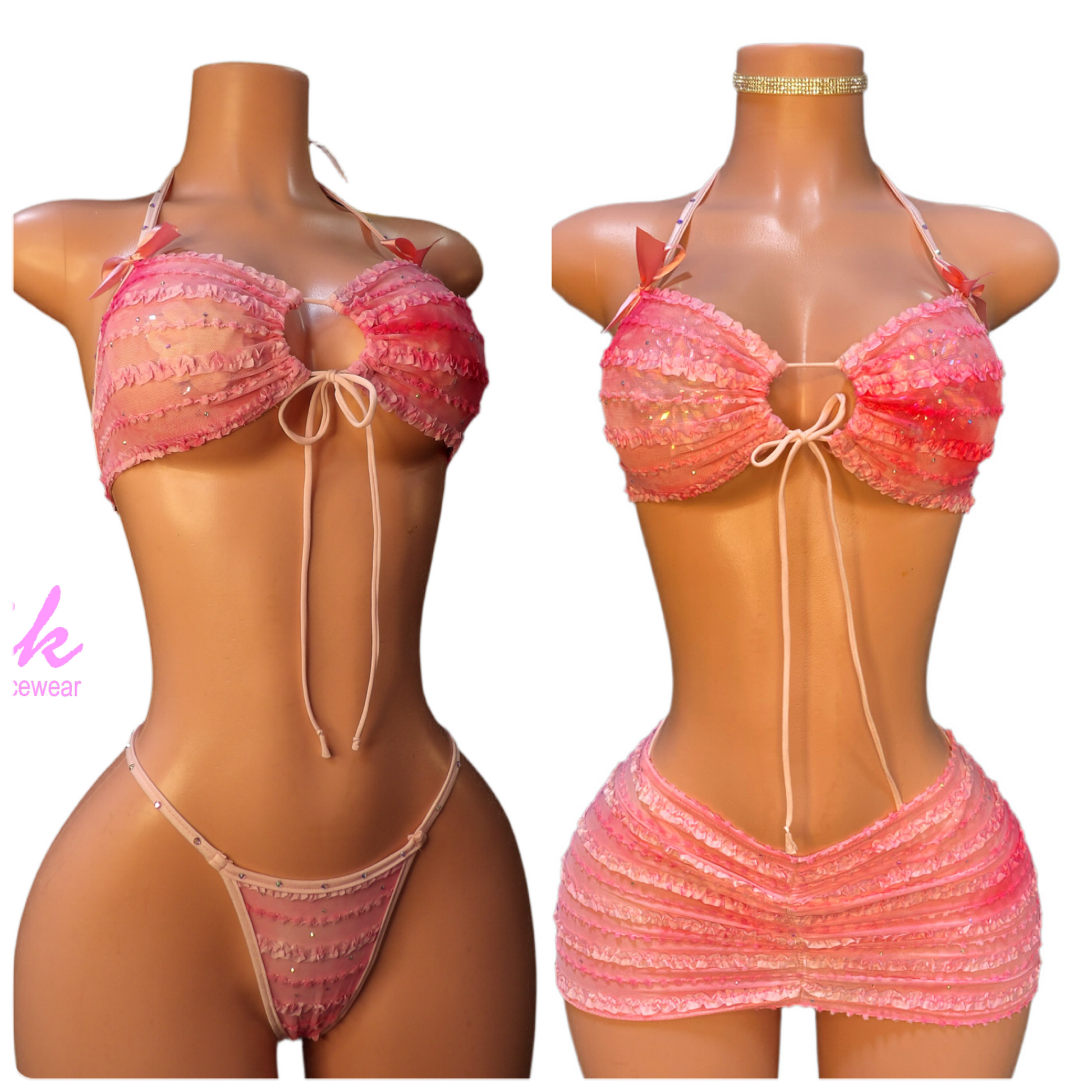 Stand out on stage in this pink ruffle exotic dancer outfit, designed to sparkle under club lights and accentuate every curve. This 3-piece stripper clubwear set includes a halter-style tie bra matching thong and a body-hugging mini skirt, layered with shimmering ruffle details that move with you while you dance.
